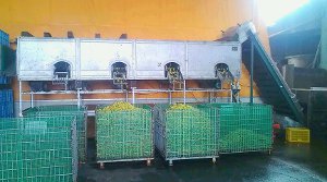 十分に洗浄した後に選果機で大きさを揃えます。 パレテーナに受けてパレテーナで漬け込みするので楽々です (^^)v 20〜21%の塩で漬け込みます。